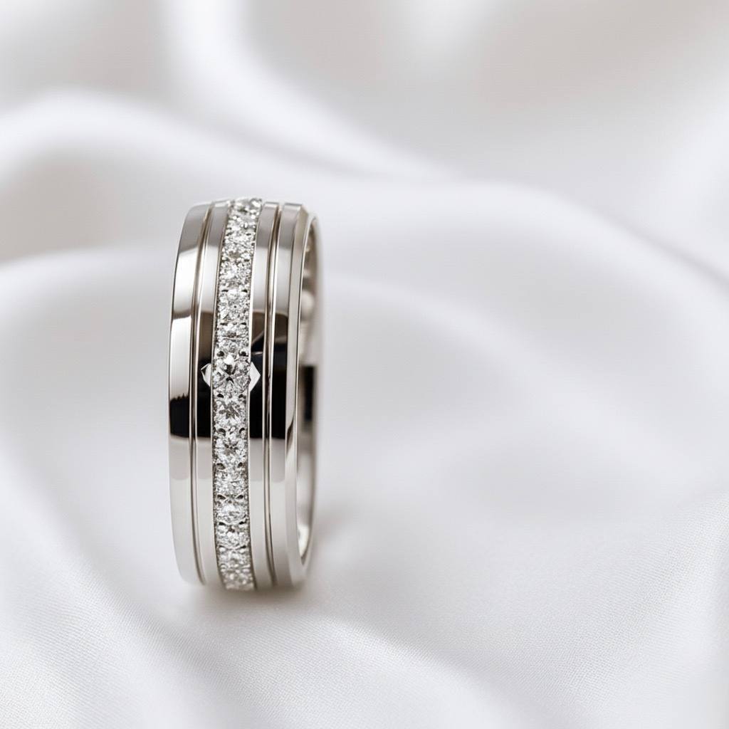 ALIANÇA DE PRATA 6,0MM QUADRADA C/15 PEDRAS DE 1,25MM E 2 FRISOS 0,50MM