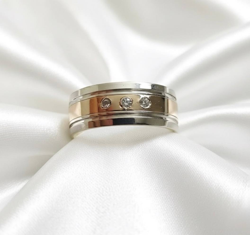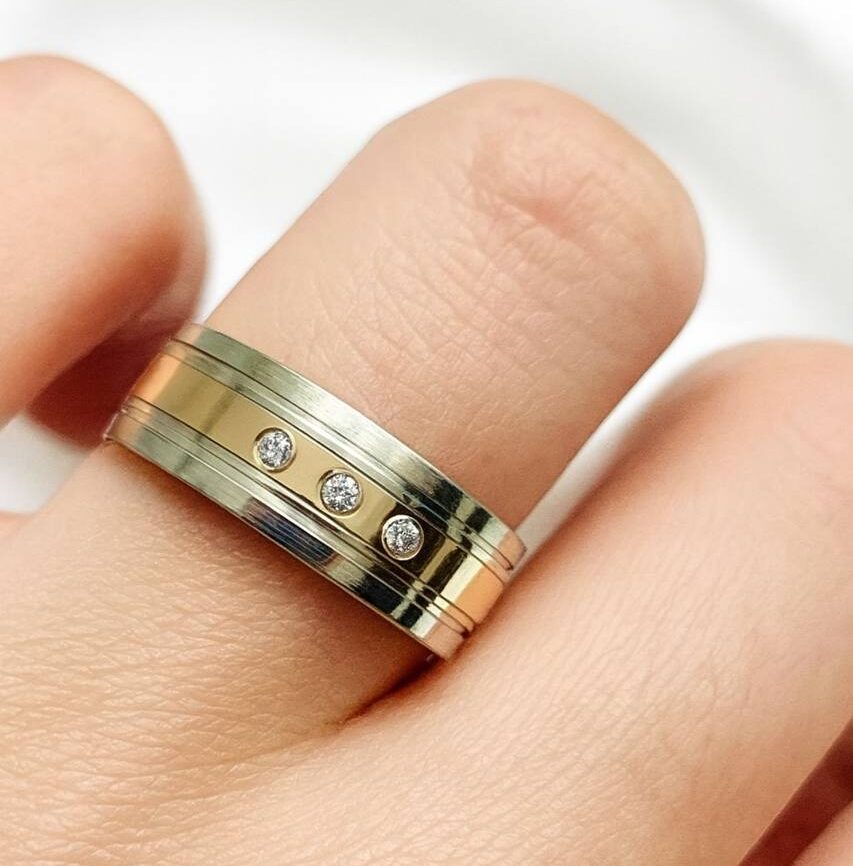 ALIANÇA DE PRATA C/CHAPA DE OURO 10K 8,0MM *ANATÔMICA QUADRADA C/03 PEDRAS