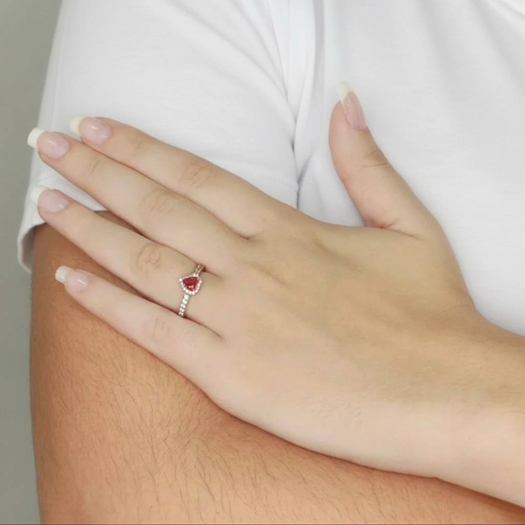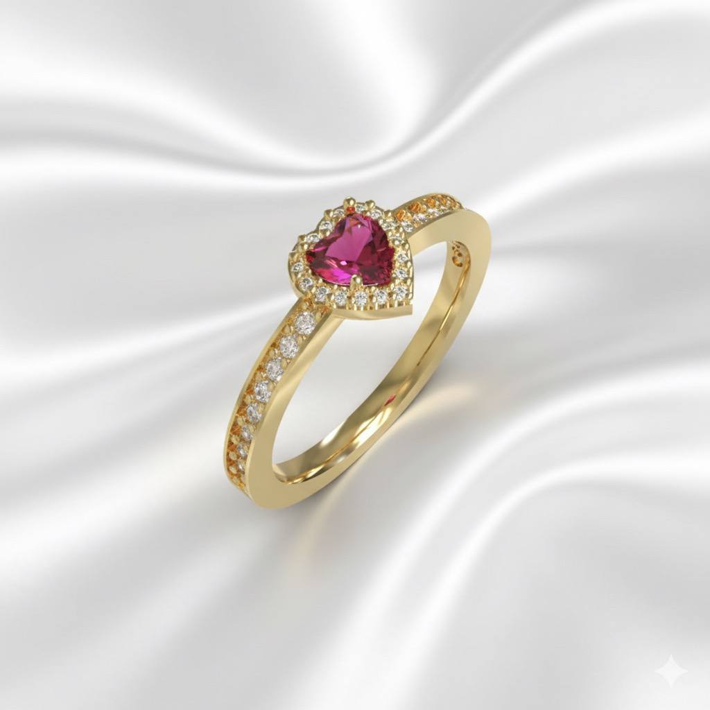 Anel formato de coração da Liga da Moeda com pedra centra de zircônia de coração em destaque no topo da peça com pedras menores envolta do coração , Nas laterais, fileiras simétricas de pedras de zircônia menores cravejada.